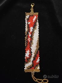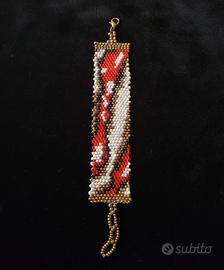 La trama preziosa fonde la precisione delle perline Miyuki in vetro nelle nuance del bianco, nero e rosso con tocchi luminosi in bronzo, che donano un riflesso metallico e senza tempo. La struttura è flessibile, leggera sulla pelle e dotata di una pratica chiusura a lunghezza regolabile per adattarsi perfettamente a ogni polso. Un accessorio etnico e ricercato, ideale per chi ama i dettagli artigianali unici.