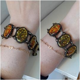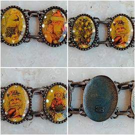 Fantastico bracciale vintage firmato Avon N R (Nina Ricci) di ispirazione vittoriana in metallo color bronzo anticato formato da 5 medaglioni ovali in vetro.