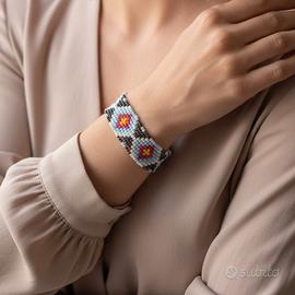 Questa esclusiva parure artigianale, interamente cucita a mano senza l'ausilio del telaio, incarna un'eleganza etnica e contemporanea. Il bracciale presenta una trama fitta e precisa, dove le lucenti rocailles di ottone si intrecciano a perline di vetro in una palette multicolore su base nera, creando un pattern geometrico vibrante. La struttura flessibile avvolge il polso con delicatezza, completata da una pratica chiusura a moschettone in acciaio anallergico e una catenella di estensione regolabile per un comfort su misura. Gli orecchini pendenti richiamano perfettamente il design del bracciale, donando luce al volto con un movimento armonioso. Un set unico che celebra la maestria del fatto a mano.