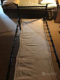 il canapone è pari al nuovo e le parti metalliche sono verniciate di nero , la vernice è ottima. Si montano senza attrezzi e facilmente, si posizionano singolarmente o a castello. Per chi ha fatto il servizio militare ha già capito ! (nelle foto le fasi del montaggio). Con il canapone al posto della rete sono facili da trasportare, ed inoltre non serve il materasso.