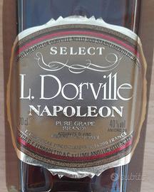 Bottiglia vintage di Brandy francese L.Dorville Napoleon Select fine anni 70 inizio anni 80 da collezione per appassionati di distillati storici. Marca L.Dorville (Negociants a Jarnac Francia), Pure Grape Brandy (Acquavite di vino), classificazione Napoleon Select, formato 70 cl, gradazione 40%. In ottimo stato di conservazione, il livello del liquido è alto, presente e intatto il sigillo fiscale italiano "Stato Italiano" (serie rosa) che ne certifica l'autenticità e l'importazione dell'epoca da parte della G.F. Ferraretto &C. Milano.