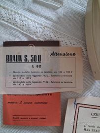 Il primo rasoio elettrico S50 anni '50 della Braun mai usato, completo di tutto. Scatola con segni del tempo.