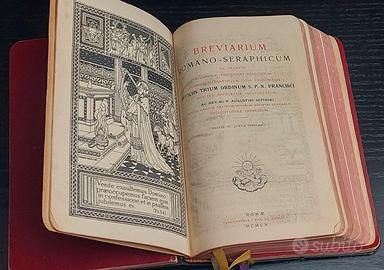 ART-0061 Breviarium Romano-Seraphicum 1960 latino raro 📜 Annuncio Subito.it: 💶 Prezzo: 87 € non trattabili 🚛 📦 🚀 SPEDIZIONE RAPIDA con Subito Etichetta di spedizione fornita da Subito Tempi di consegna: 3-5 giorni lavorativi 🚀 📍 Ritiro a mano: disponibile in frazione di Sessa Aurunca (CE) Vendo Breviarium Romano-Seraphicum, edizione 1960, stampato a Roma presso la tipografia Pax et Bonum. Si tratta di un breviario liturgico cattolico in lingua latina per l’Ordine dei Frati Minori, utilizzato per la recita dell’Ufficio Divino secondo il rito pre-Vaticano II. Il volume raccoglie 5 tomi in un unico libro (Sanctorale, Temporale, Proprium, Comune e Appendici), con segnalibri originali in stoffa multicolore, copertina in pelle con fregio “IHS” e dorso con titolo in oro. 📅 Caratteristiche principali: Anno: 1960 (MCMLX) Luogo di stampa: Roma Tipografia: Pax et Bonum Lingua: Latino Formato: Tascabile, rilegatura in pelle, fregio IHS in oro Pagine: numerose, testo in nero e rosso Illustrazione iniziale a piena pagina 📝 Condizioni: 📌 Volume in buone condizioni generali: Copertina integra con lievi segni d’uso Pagine ben conservate, senza strappi, con normale ingiallimento Segnalibri originali in stoffa ancora presenti Legatura solida, volume completo 🎯 Perché acquistarlo: Edizione pre-riforma conciliare Rilegatura in pelle di qualità con dettagli in oro Pezzo da collezione per studiosi, collezionisti e amanti della liturgia tradizionale 📦 Spedizione e ritiro: Spedizione GRATUITA con corriere espresso tracciato Imballaggio protettivo Ritiro a mano disponibile in frazione di Sessa Aurunca (CE) 💬 Nota bene: Vendita con formula "visto e piaciuto". Nessun reso per motivi legati a condizioni estetiche già descritte e fotografate. 📩 Contattami per ulteriori foto o domande.