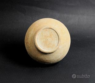 Originale brocca in terracotta a grana fine chiara, dell'antica civiltà Romana, a forma di caraffa bombata con manico ad arco scanalato a due lobi.