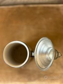 Il coperchio in peltro è finemente decorato con motivi floreali Questo coperchio era un elemento igienico, introdotto nel tardo Medioevo per proteggere la birra da insetti e polvere.