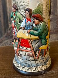 La decorazione principale mostra una scena tradizionale di persone in abiti bavaresi (tracht), probabilmente in una taverna o un'osteria, intente a bere e a giocare a carte.