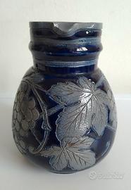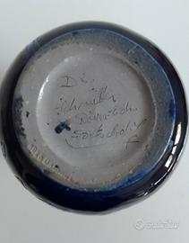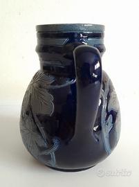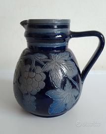 Brocca in gres vintage proveniente da Betschdorf in Alsazia, Francia. Interamente fatta a mano e decorata con la tipica tecnica dello smalto al sale. Il gres al sale è una tecnica di vetrificazione secolare. Durante la cottura sulla fiamma a 1250°C, il sale viene proiettato nelle aperture del forno previste a tale scopo. I vapori di sodio permeano quindi l'argilla e si legano alla silice presente in essa. Il risultato è un leggero strato di vetro, dall'aspetto leggermente granuloso, che ricopre l'interno e l'esterno della ceramica. La vetrificazione al sale produce un coccio inalterabile e impermeabile, che lo rende un ottimo vasellame da conservazione. Il vaso è in perfette condizioni salvo un piccola scheggiatura dello smalto sul beccuccio(vedi foto). È firmata dall'artista. Altezza 16,5 cm, 850 g tiene poco meno di 1 litro. Vedi le altre brocche d'Alsazia fra i miei oggetti in vendita.