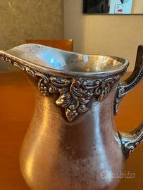 Brocca ARTIGIANALE in ARGENTO Sheffield della ditta Fani Benito degli anni '80 alta 18 cm. e larga, compreso il manico circa 18 cm. peso più di 900 gr, c'è il punzone della ditta sul fondo della brocca. Da collezione