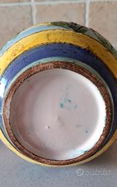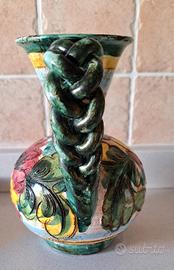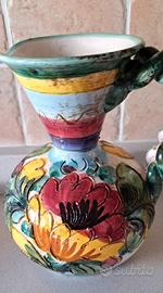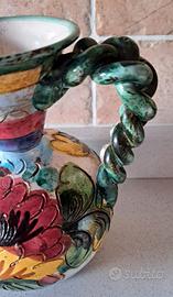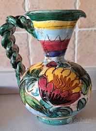 Brocca o portafiori in ceramica artigianale vintage tipica della tradizione di Caltagirone. Caratterizzata da decorazioni floreali dipinte a mano e un manico intrecciato. altezza 17 cm, diametro sopra 8× 8 cm.