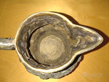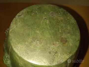 Brocca in stile vintage decorata con motivi di uva firmata La Rochelle. Sobrietà senza tempo in questa splendida brocca che mette in risalto le armoniose forme dei tralci d'uva con la testa del dio Bacco sul davanti. In ottime condizioni. Misure di riferimento in foto. Le foto descrivono esattamente la brocca e sono parte integrante della descrizione. Visita il mio profilo per altri vasi in bronzo e non solo.