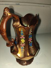 Brocche antiche risalenti alla metà dell' '800, una francese in vetro colorato ed una in porcellana dorata 70 euro cadauna, entrambe 120 euro.