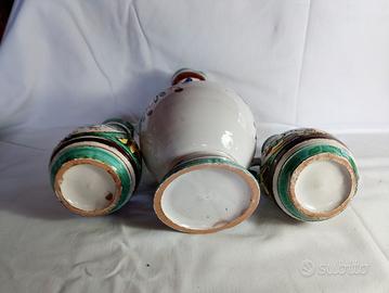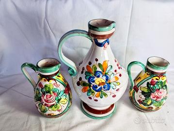 tris brocche in ceramica maiolica vintage, dipinte a mano con un motivo floreale.