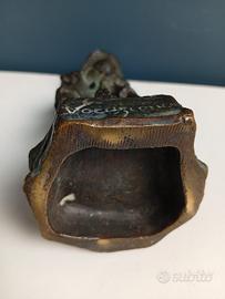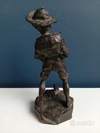 Scultura in bronzo di ragazzo mentre urina scherzosamente. Sulla base Vocazione