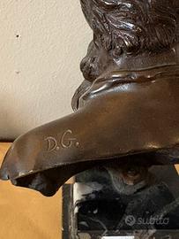 Firmato “DG”, è da Vincenzo Gemito rientra nella produzione verista ottocentesca, ispirata al realismo ritrattistico dell’epoca (area Meissonier). Elegante busto da collezione di forte carattere espressivo.
