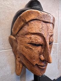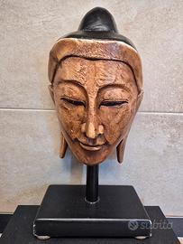Questa scultura raffigurante il volto di un Buddha è un pezzo di grande impatto visivo, capace di integrare perfettamente il fascino dell'arte orientale con le esigenze del design contemporaneo. Realizzata interamente in legno, l'opera si distingue per una presenza materica importante, confermata dal peso solido di 1520 grammi che ne testimonia la densità e la qualità costruttiva.