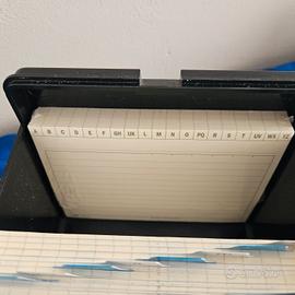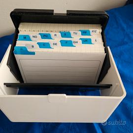 “Schedario alfabetico vintage in plastica rigida, completo di divisori A-Z. BUFFETTI Ideale per ufficio, studio o arredamento retrò. In OTTIME condizioni generali, Set Schede di ricambio complete . Funzionante e pratico. Misure compatte, perfetto anche come oggetto decorativo.”
