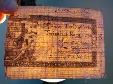 Raro Buono emesso da Regie Finanze Torino, Regno di Sardegna, Regno di Vittorio Amedeo III emesso il 15 Maggio 1794 con le firme di Viventi, Rossi, Jeandet – Barberis in buono stato di conservazione senza tagli ne’ strappi (qualita’ BB) con una piegatura centrale senza significative macchie e con i bordi arrontodati. (come da foto)