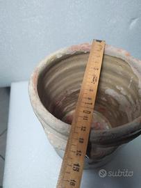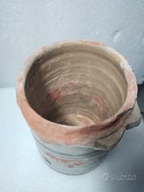 Presenta evidenti segni del tempo e dell'uso, in particolare diffuse scagliature dello smalto che rivelano la sottostante terracotta rosata, e danni lungo il bordo superiore, elementi che ne confermano l'autenticità storica e ne accrescono il fascino di manufatto d'epoca