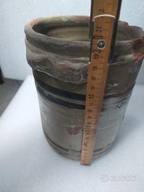 Raro e affascinante boccaletto/cilindro in maiolica di Caltagirone, espressione dell'antica tradizione ceramica siciliana. Il pezzo, presenta una forma cilindrica essenziale ed è impreziosito da fasce orizzontali di colore bruno-scuro su un fondo di smalto chiaro, tipico delle decorazioni più sobrie e tradizionali.