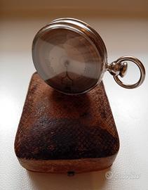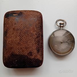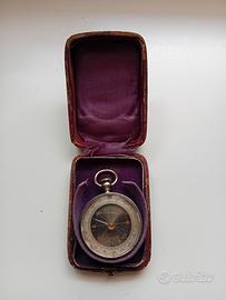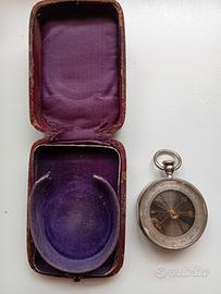 Antica bussola tascabile, da esploratore inizio '900, corpo bussola (o mortaio) in metallo "nichel/argento", con custodia originale. Caratteristiche: quadrante graduato a 360' con indicazioni cardinali ben visibili, vetro protettivo originale. Retro con meccanismo visibile (indicatore/ghiera graduata). Custodia rigida coeva, con interno sagomato in raso (segni di usura compatibili con l'età). Oggetto autentico e affascinante, difficile da reperire. Ideale per collezionisti o come regalo d'antiquariato di pregio. Trattabile.