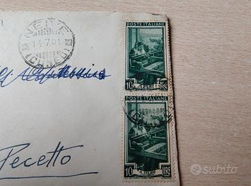 - Affrancatura: Coppia verticale del 10 Lire "Italia al Lavoro" (Soggetto: CALABRIA - Il Telaio), per un totale di 20 Lire (tariffa lettera ordinaria vigente ancora per pochi giorni prima dell'aumento di Agosto '51).
