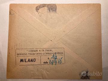 Vendo busta spedita da Milano a Bergamo il 21.6.1945 affrancata con 1 lira Monumenti Distrutti + 2x 25 cent. Fratelli Bandiera+ Leone Alato Coralit da 14 lire. Timbri di partenza e arrivo e registrazione di “Corrieri Alta Italia”. Bellissima e rara
