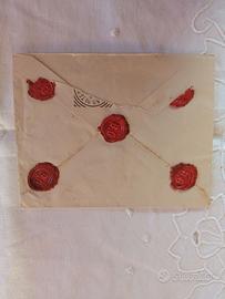 Busta di raccomandata (vuota) spedita da Istituto Antirabico di Bologna al Sindaco di Magliano di Tenna, data illeggibile ma bollo di Umberto I, manca un pezzo di carta e parte di due sigilli di ceralacca sul retro.