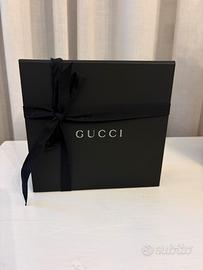 Set composto da busta e scatola Gucci con fiocco tutto originale misure 19 × 19 × 7,5 la scatola e 35 × 26 × 14 la busta. I due articoli sono vendibili anche singolarmente.