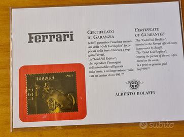 La busta affrancata con francobollo San Marino L. 800 per la Ferrari riporta lo speciale annullo commemorativo ed è impreziosita dalle "Gold Foil replica" una riproduzione dell'auto in oro 999/000