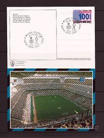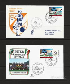 Vendo IN BLOCCO O SINGOLARMENTE le seguenti buste e cartoline con annulli dedicati all’INTER: 1) Cartolina speciale bollata il 23/05/1971 a Milano con l’annullo speciale dedicato alla vittoria nel Campionato di calcio 1970-’71. Prodotta dal Gruppo filatelico Cariplo in cartoncino, formato 17,5 x 10 cm circa, riporta al retro la cronistoria dei successi dell’Inter fino a quel momento. Prezzo: 2,00 €. 2) FDC ufficiale della Società affrancata con il francobollo “Inter Campione d'Italia 1988-’89” (catalogo Unificato n. 1893), timbrato primo giorno d'emissione con l’apposito annullo speciale utilizzato a Milano il 26/06/1989. Formato della busta 16,3 x 9,5 cm. Prezzo: 3,00 €. 3) Idem - FDC edizione “Venetia”, numerata al verso, della stessa emissione. Formato della busta 16,5 x 9,3 cm. Prezzo: 2,00 €. 4) Idem - FDC edizione “Filagrano” della stessa emissione. Formato della busta 16,5 x 9,5 cm. Prezzo: 3,00 €. 5) Cartolina illustrata dello Stadio Meazza di San Siro, formato 17 x 12 cm, con annullo speciale celebrativo dell’incontro di Coppa UEFA 1997-’98 Inter – Neuchatel Xamax (16/09/1997). Prezzo: 2,00 €. 6) Stessa cartolina, con annullo speciale celebrativo dell’incontro di Coppa UEFA 1997-’98 Inter – Lione (21/10/1997). Prezzo: 2,00 €. 7) Busta con annullo speciale celebrativo dell’ “Inter squadra vincitrice Coppa UEFA 1997/1998”, utilizzato a Milano il 7/05/1998. Prezzo: 1,50 €. 8) Busta con annullo speciale utilizzato l’11/05/1998 per l’incontro di calcio “Uno di noi”, la partita di addio al calcio di Walter Zenga che fu giocata a San Siro il 12/05. Prezzo: 1,50 €. 9) Busta ufficiale del F.C. Internazionale, prodotta dalla Bolaffi, celebrativa della vittoria della Supercoppa italiana 2006, bollata il 26/08/2006 con l’annullo di Milano Isola Filatelico. Formato della busta 16,4 x 10,6 cm. Prezzo: 3,00 €. PREZZO SPECIALE LOTTI 1/9 (3 cartoline + 6 buste) = 18 €. Cartoline e buste disponibili in vari esemplari, tutti in condizioni di conservazione ottime.