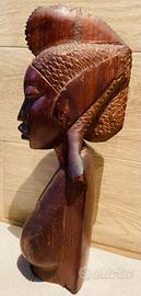 Busto in legno mogano intagliato a mano raffigurante una donna Fulani che indossa un elaborato pezzo di seta sui capelli intrecciati.?La scultura si presenta con una finitura opaca.