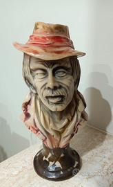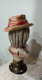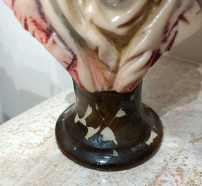 Bellissimo busto decorativo vintage risalente agli anni '70/'80, realizzato in resina alabastrina (polvere di alabastro e resina) con una splendida finitura traslucida. La scultura raffigura un anziano signore con baffi, cappello e sciarpa, tipica della produzione artigianale italiana di qualità dell'epoca. Il volto è caratterizzato da un'espressività notevole, accentuata da sfumature di colore applicate a mano che donano profondità allo sguardo e alle rughe. Altezza: circa 19 cm. Materiale: Resina pesante effetto alabastro. Stato: Ottime condizioni generali. Il viso e il corpo sono integri. La base presenta alcune screpolature della vernice dovute al tempo (facilmente ritoccabili se desiderato). Un pezzo di carattere per chi ama gli oggetti che raccontano una storia.