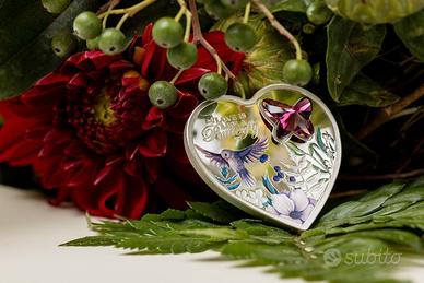 Questa bellissima moneta d'Argento è parte della serie "Silver Hearts collection", dedicata all'Amore e al magico giorno di San Valentino. La moneta ha una bella forma a cuore, presenta un meraviglioso elemento Swarovski, ha una qualità Proof e viene fornita in un cofanetto adorabile, insieme al Certificato di Autenticità. Tiratura limitata a 2.023 pezzi nel mondo.