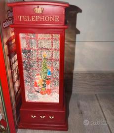 Splendida decorazione natalizia a forma di cabina telefonica rossa in stile londinese, con all’interno Babbo Natale, un elfo e un albero di Natale illuminato.