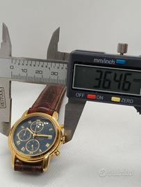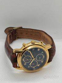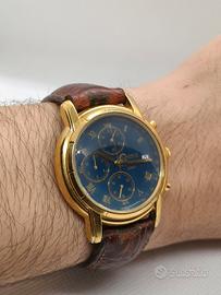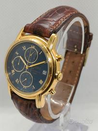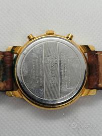 Vendo orologio Cadet Chronostar uomo con cassa in acciaio dorato mm 36 , funzione crono , datario , corona a pressione e fondo wr 3 atm . Cinturino in pelle con cuciture laterali.