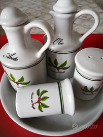 Vendo omaggi caffè vergnano anni 90 PORCELLANA BRASILIANA VERACRUZ decoro con pianta del CAFFÈ sono divisi in tre set ... SET olio e ACETO con VASSOIO tondo decorato con pianta del caffe PREZZO € 15 Sullo stesso stile un bel servizio in robusta porcellana brasiliana VERACRUZ per caffè.... Sei tazzine e piattini più zuccheriera fondo bianco e decoro.. Prezzo € 15 Una graziosa Pirofila con decoro contenuta in un elegante cestino. Misura cm 23/15 Prezzo € 5 Inoltre Una scatola in latta che conteneva cioccolatini al caffè con immagini in rilievo della pianta, marca diversa POCKET COFFEE Misura cm 13,5 alt,9x9 la base. Prezzo € 8 Spese di spedizione secondo quantità. e peso