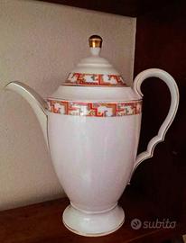 Caffettiera teiera Edelstein Bavaria "Thea" Irene. Anni 30. Motivo astratto Art Deco in oro arancio nero giallo azzurro. Condizioni molto buone. Oro e smalto ben conservati. Vedi foto. Segnalata minuscola scheggiatura all'interno del coperchio.