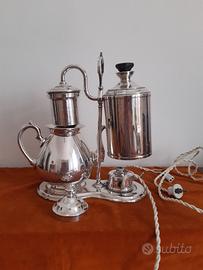 Caffettiera elettrica basculante per preparare caffe' filtrato. Il brevetto di H.Eicke e' del 1878 ed il riscaldamento/bollitura dell'acqua del serbatoio era garantito da un fornello ad alcool dotato di cappuccio che spegneva la fiamma quando l'acqua era passata dal lato filtro. Questo modello elettrico e' stato commercializzato intorno al 1920. Ha lo stesso principio di funzionamento e l'interruzione della corrente e' dovuta ad un interruttore a mercurio. Realizzata in metallo argentato ha una alimentazione elettrica a 125 V ed una potenza di 500 W. Il cavo di alimentazione e' stato sostituito per usura. E' funzionante utilizzando un "trasformatore" autocostruito fornito con la vendita utilizzando un diodo (fornisce in uscita 110 V in corrente continua) ATTENZIONE: nessuna garanzia su questo trasformatore che puo' essere utilizzato solo per il funzionamento della caffettiera (SOLO carico resistivo). La caffettiera e' in metallo argentato che come l'argento tende a scurirsi. Le foto riportano l’oggetto scurito e poi lucidato (si lucida facilmente con comuni prodotti per argento/metalli). Dimensioni: alt cm 37, largh cm 27 prof cm 23 Peso 3602 g, con trasformatore 4011 g Le foto fanno parte integrante della descrizione. La caffettiera e' funzionante, il trasformatore e'incluso nel prezzo.