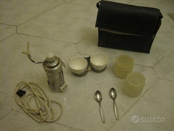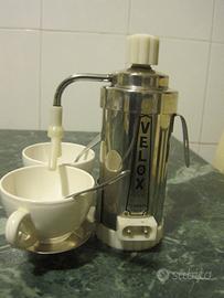 Vecchia caffettiera della prima metà del 900 in acciaio e bachelite. Made in Italy. Ing. P. Malagò, Ferrara. Voltaggio 220 volts, completa di cavo elettrico (da verificarne il funzionamento data la sua età). Svitando il vitone superiore si apre il serbatoio dell'acqua, subito sopra vi è alloggiato il filtro per la deposizione della polvere di caffè. Lungo becco doppio per la fuoriuscita della bevanda da riversare direttamente in due tazzine.Completa di stuccio originale di colore blu . Probabilmente mai usata, filtro e guarnizione come nuovi. Come da fotografia. Da esporre fra altri vecchi utensili o attività commerciale di tipo bar/ristorazione.