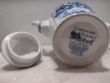 Caffettiera parte di un servito da caffè in fine porcellana inglese Iron Stone, tema " Carrozze" fine anni 60 del XX secolo, marchio Johson Bros. Come nuova, mai utilizzata e sempre conservata in vetrina. Marchio molto conosciuto dai collezionisti ora fuori produzione.