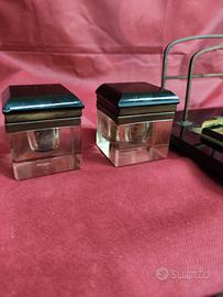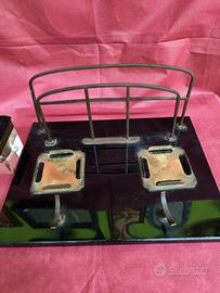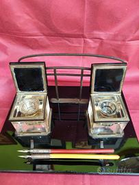 Bellissimo calamaio da scrivania degli anni '30. Un pezzo elegante e raffinato, perfetto per chi ama oggetti vintage. Completo di porta documenti. Base e , calamai in vetro pesante e porta documenti e poggia pennino in ottone con patina originale del tempo