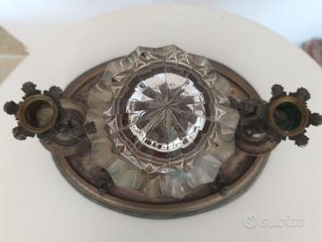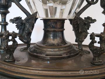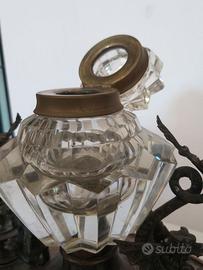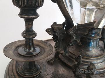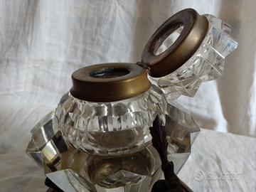 Raro e magnifico calamaio da scrivania della seconda metà del secolo XIX. Realizzato con grande maestria nei suoi elementi in metallo argentato, con draghi, è ottimamente conservato anche nella boccetta in cristallo molato con finitura in ottone. La base è in legno ebanizzato. L’insieme è conservato splendidamente, con possibilità di lucidare la parte argentata per renderla più brillante. Si tratta di un oggetto da alto collezionismo, di manifattura veneziana e proveniente dall’arredamento di importante proprietà in Venezia. Misure: 26 x 20 x H.22 cm Le foto rappresentano il bene così come venduto.