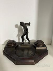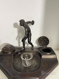 Antico calamaio con iconica figura sportiva discolobo, presenti anche i due bicchierini in vetro originali e due punte per penna stilografica originali.