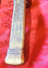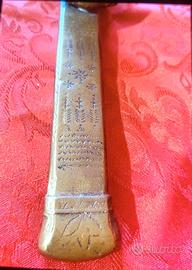 Calamaio o porta penne ottomano Qualandam da viaggio in bronzo con incisioni davanti e retro. Misure Lunghezza cm 22