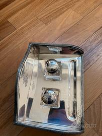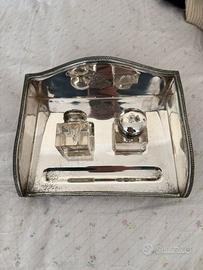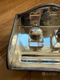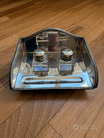 Vendo elegante calamaio da scrivania in stile inglese Royal Sheffield, completo di due boccette originali in vetro con tappo. Struttura in metallo argentato (silver plate) con decorazioni classiche e stemma inciso. Presente anche il vano porta penna frontale. Oggetto vintage ideale come complemento d’arredo, per studio o per collezionisti. Condizioni: Buone condizioni generali. Normali segni del tempo e usura della placcatura (visibili in foto). Vetro integro. Consegna: - Ritiro a mano oppure spedizione a carico dell’acquirente Contattami per ulteriori foto o informazioni.