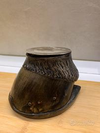 Raro calamaio vittoriano in autentico zoccolo di cavallo con montatura in argento inglese. Il corpo è ottenuto da un vero zoccolo equino, ancora completo del suo ferro con chiodi originali, trasformato in elegante oggetto da scrivania secondo la tradizione equestre anglosassone di fine Ottocento / inizi Novecento. La parte superiore è in argento sterling finemente cesellato a imitazione del pelo, con coperchio incernierato e bordo perlato che accoglie il serbatoio interno in vetro estraibile. Sotto il coperchio sono impressi i punzoni britannici dell’argento (leone passante, lettera dataria e marchio di argentiere), che ne confermano l’origine inglese e la produzione d’epoca. Oggetto da collezione di forte impatto scenografico, ideale per collezionisti di memorabilia equestri, argenti antichi e accessori da scrittoio ottocenteschi; perfetto come pezzo da conversazione su una scrivania classica o in uno studio arredato in stile.”