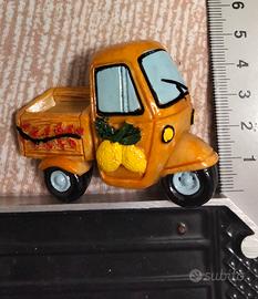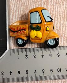 Calamita Ape Car Stile Siciliano Con Limoni Souvenir Sicilia. Calamita in ceramica in rilievo (no stampa) che riproduce un' Ape Car siciliana con decorazione limoni. Misure come in foto