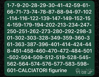 Vendo o scambio carte figurine calciatori Panini Queste sono i miei doppioni con il sfondo verde 1-7-9-20-28-29-30-41-42-59-61-66-71-73-74-78-87-88-94-97-102-114-116-122-139-147-149-152-154-159-179-194-202-213-234-247-250-251-262-273-280-292-298-301-302-303-328-349-359-360-361-363-387-396-401-414-424-448-451-458-460-470-472-484-501-502-504-509-512-519-528-545-562-564-574-576-577-583-598-601-CALCIATORI figurine 0,25 l’uno disponibile consegna a mano o la spedizione +3€