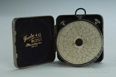 This example is the "long scale" model, consisting of a metal case with a ring, two knobs, and two rotating paper discs covered with glass. The front has a short logarithmic scale and a long logarithmic scale, laid out in six concentric circles rather than in a spiral. These scales are rotated by the knob on the left. The glass is marked with two hairlines. The interior of the disc reads: FOWLER'S (/) LONG SCALE CALCULATOR (/) PATENT (/) FOWLER & Co MANCHESTER.