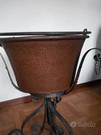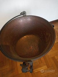 Bellissimo paiolo o calderone antico in rame lavorato e forgiato a mano con manico in ferro battuto, in perfette condizioni.